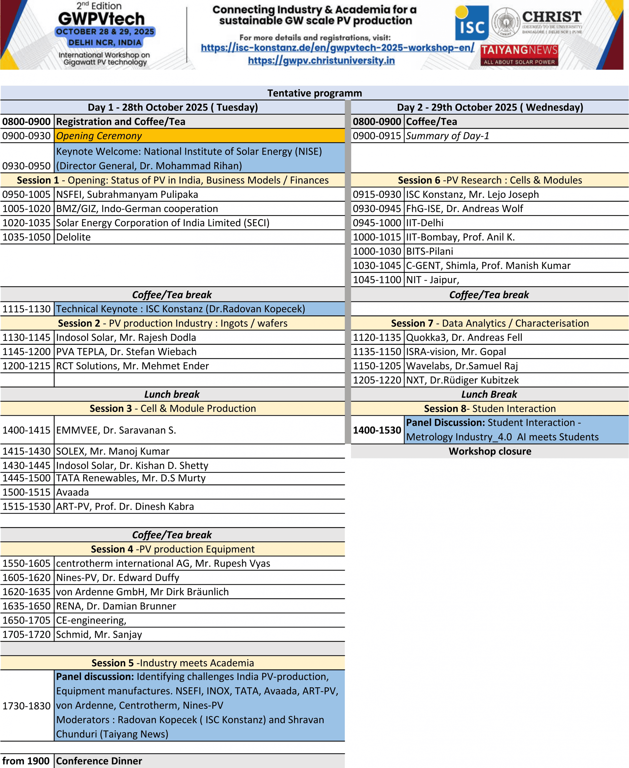 The Indian-German workshop on solar cell manufacturing addresses the critical need for collaboration to strengthen India’s photovoltaic (PV) ecosystem. India’s ambitious renewable energy targets require overcoming challenges such as reliance on imports, limited manufacturing capacity, and gaps between research and industry. GWPVtech2025 workshop platform brings experts from Germany & India together to establish joint knowledge pools to address global challenges and serving as a nerve centre to promote Indo-German technology partnership.