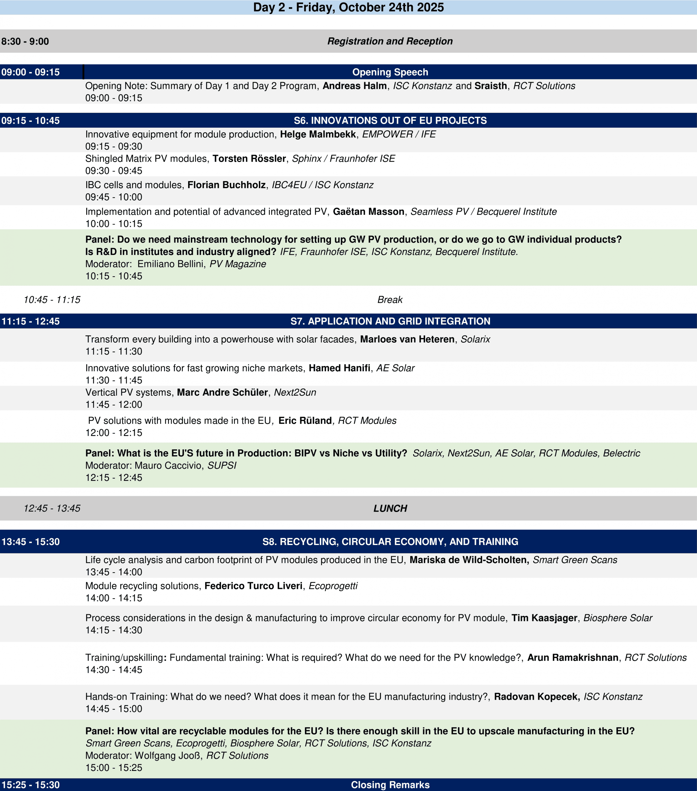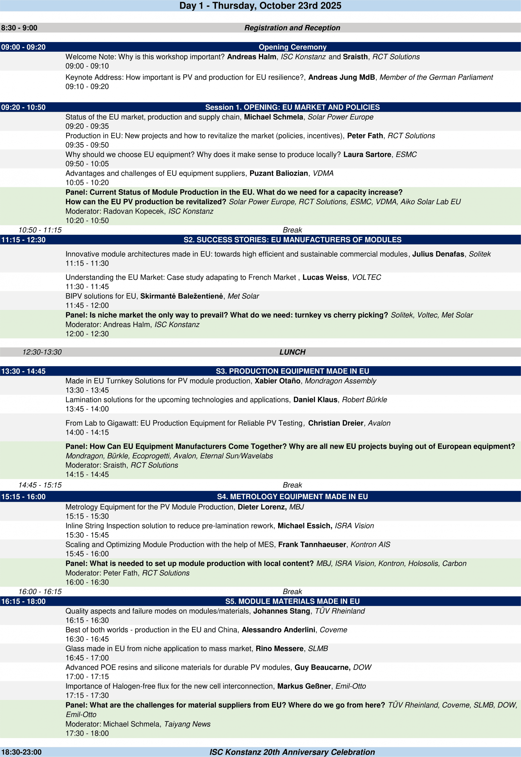 Prior the workshop, October 22, we will host the Advisory Board Meeting of ISC Konstanz and October 23 in the evening we will celebrate 20 years of ISC Konstanz at our institute. We also take the opportunity to offer deeper technical presentation about our large EU Project IBC4EU and run training sessions regarding hands on PV production in our cell and module pilot lines.